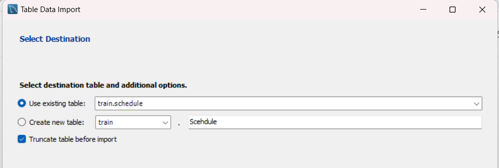 아까 만들어둔 schedule 테이블에 데이터를 넣을 것이므로 Use existing table을 선택한다.