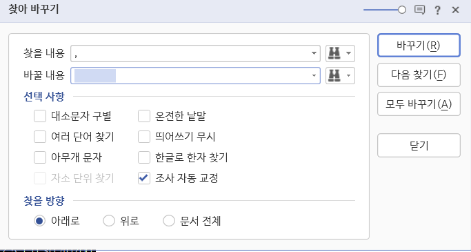 그리고 찾을 내용에 구분된 문자(,)를 넣고, 바꿀 내용에 Tab 키를 넣고 모두 바꾸기를 누른다.