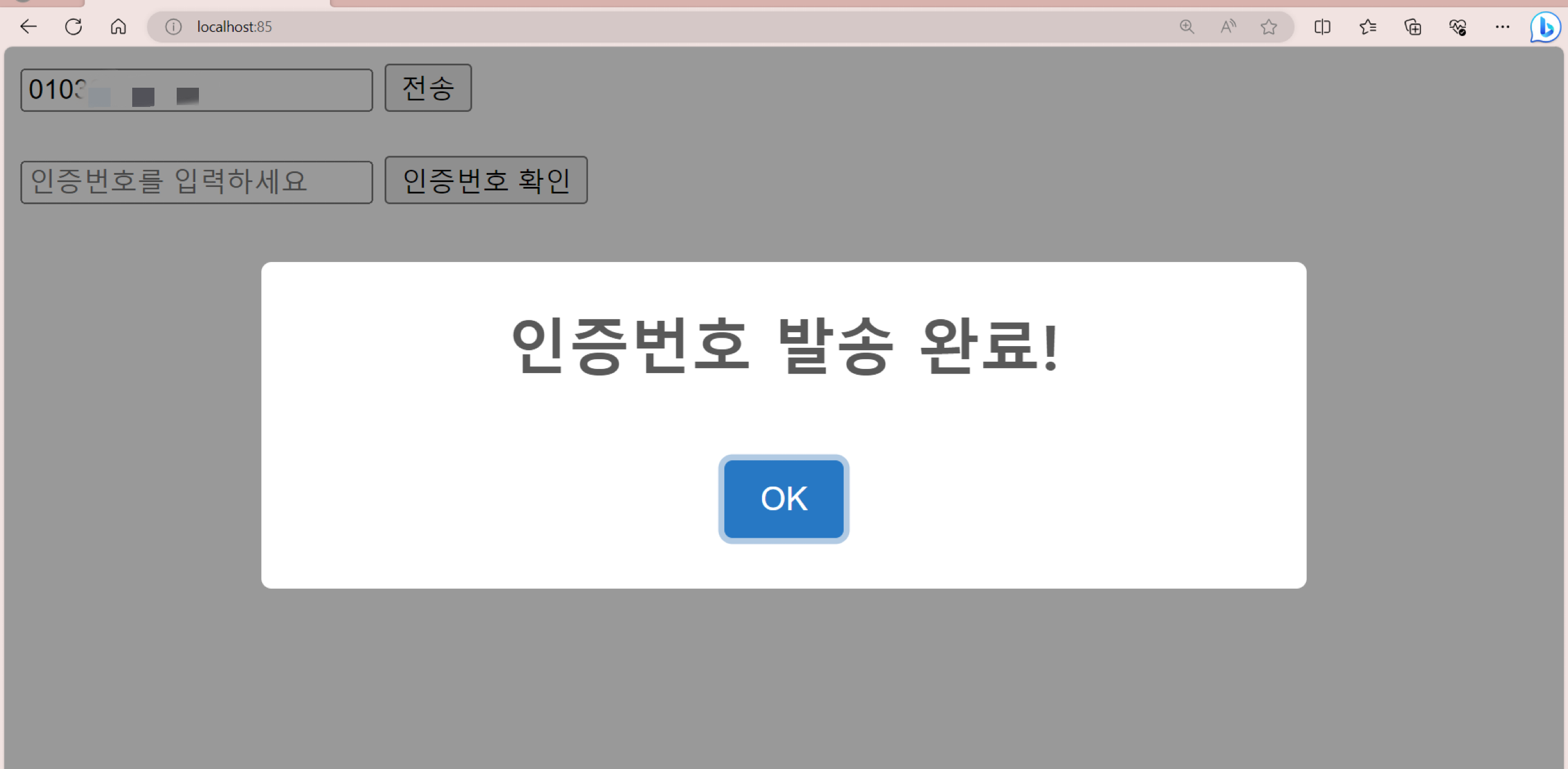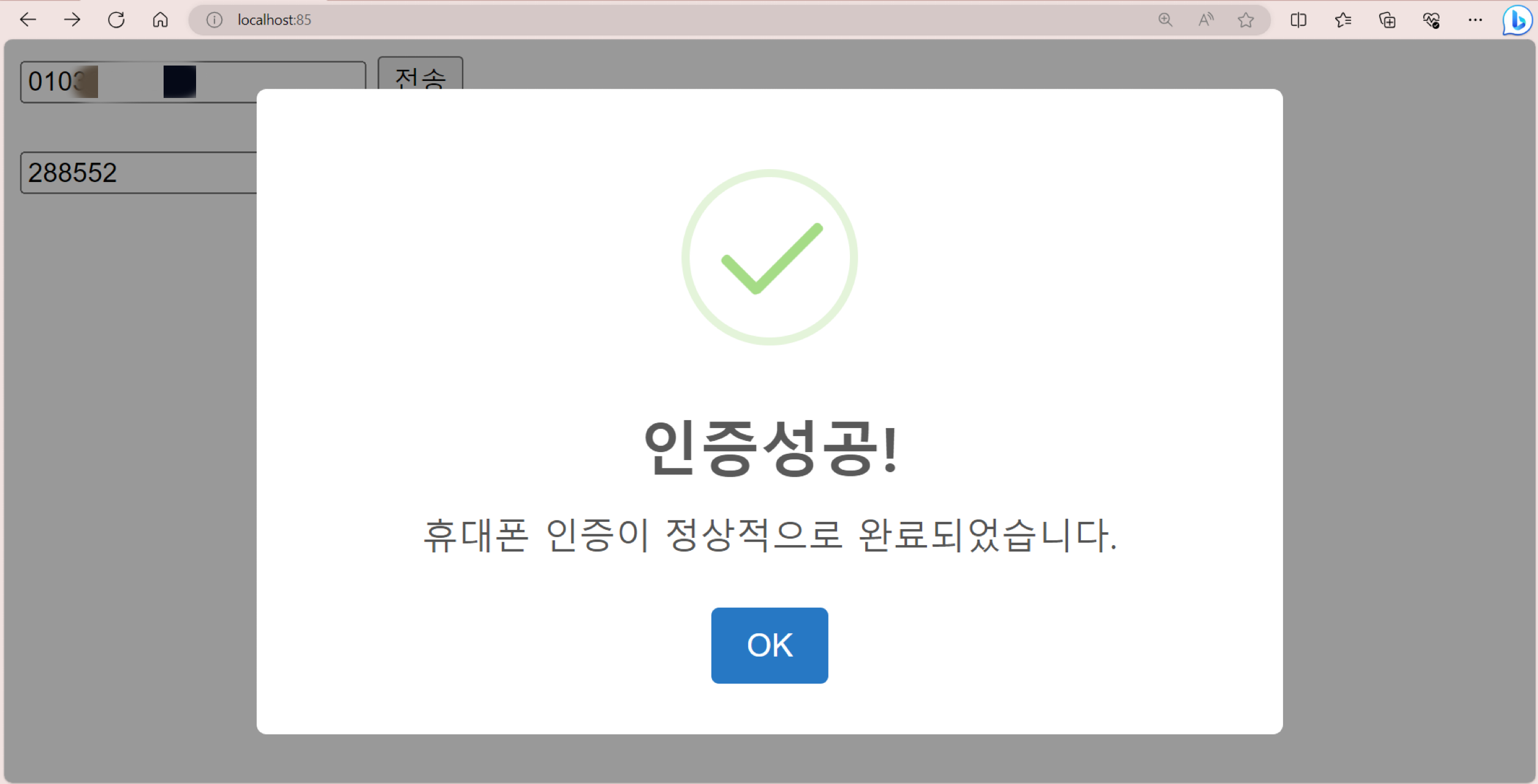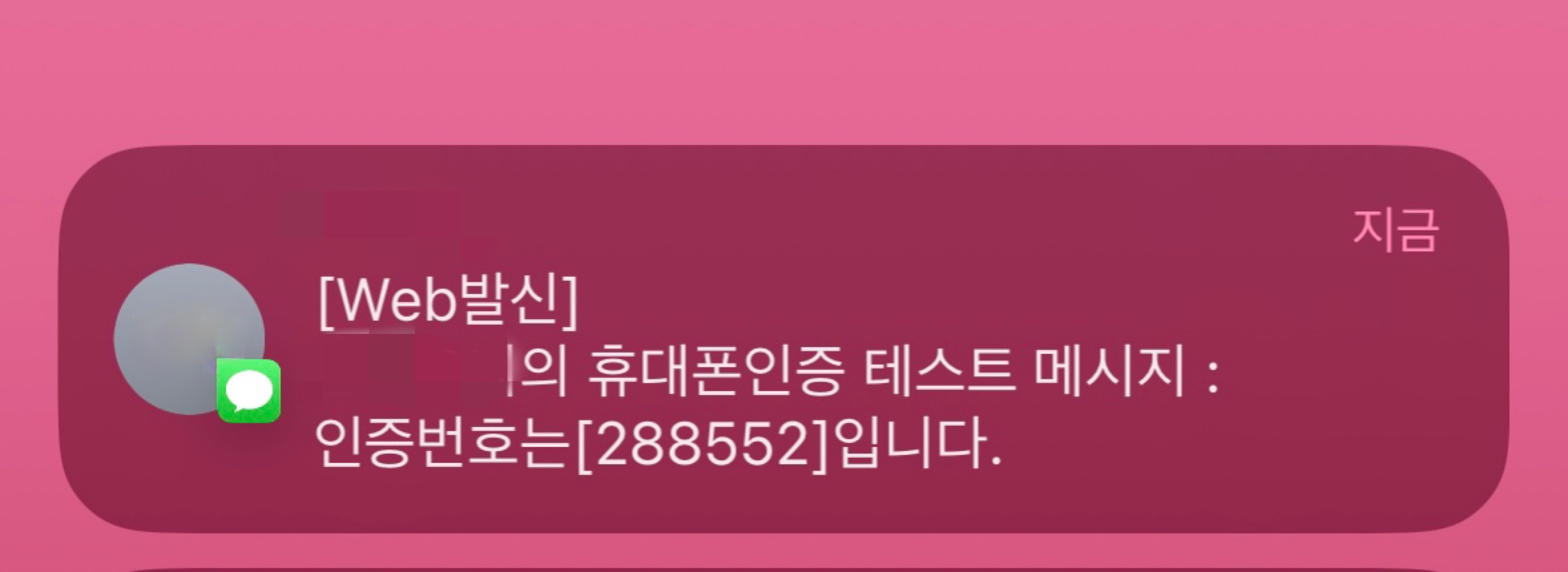 휴대폰으로 잘 문자가 오고 받은 인증번호를 입력하면 인증 성공한다.