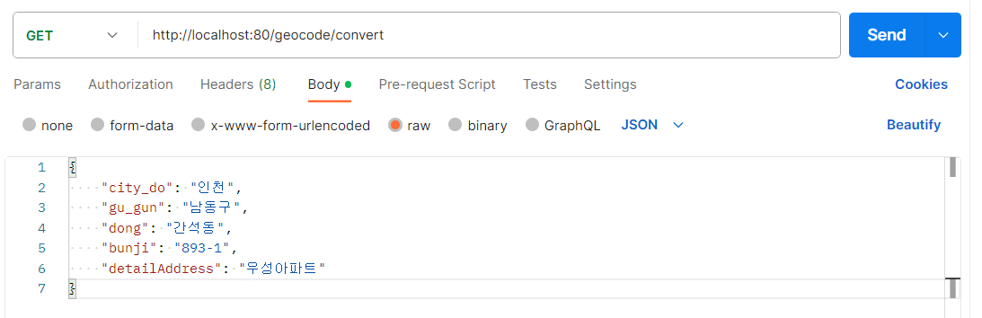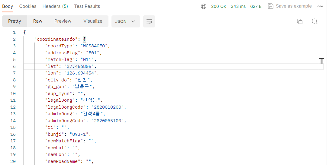 요청 결과로 lat(위도)과 lon(경도)이 잘 반환된 것을 볼 수 있다.