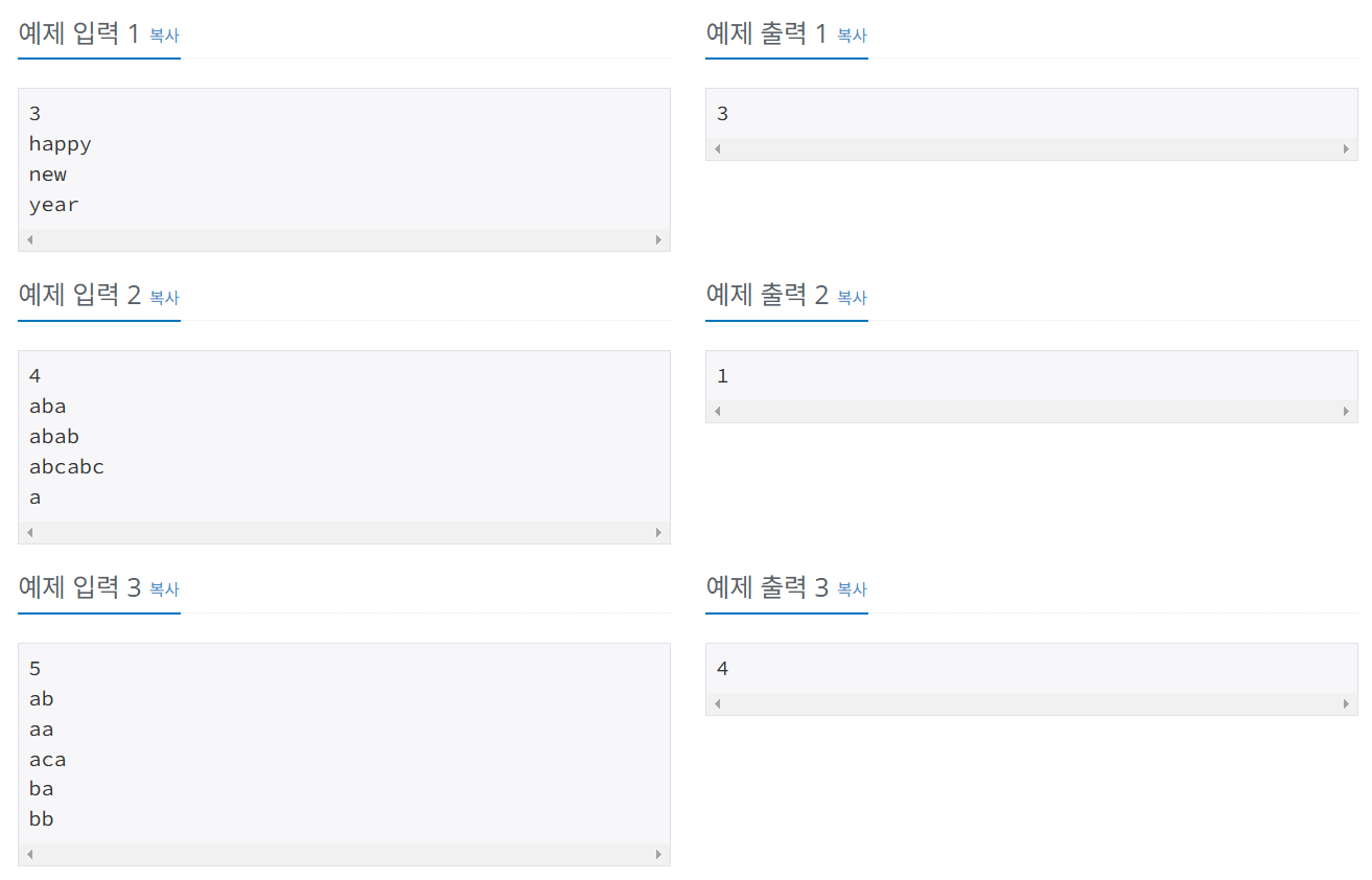문자열 한 줄씩 그룹 단어인지 검사할건데