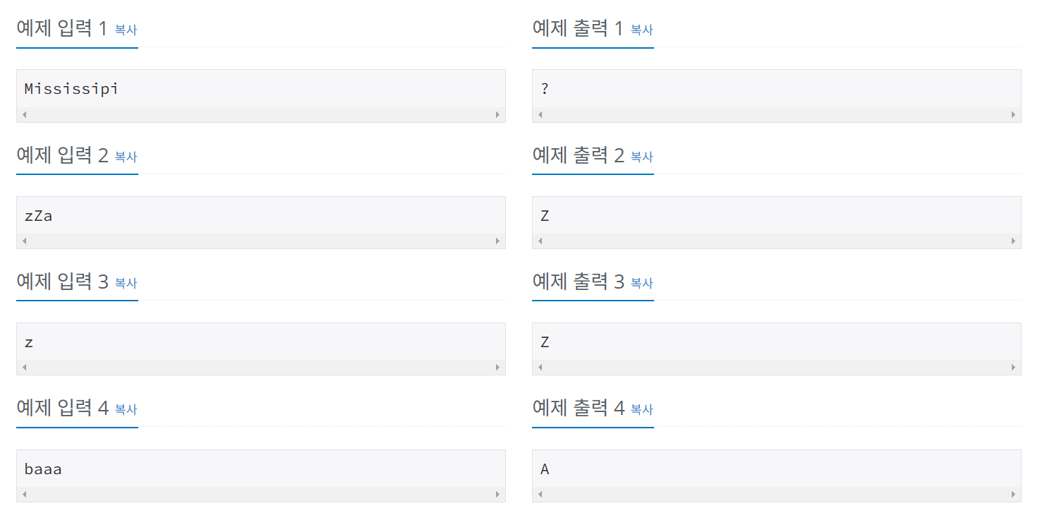 이후 최대값이 여러번이면 물음표 출력, 그렇지 않으면 알파벳 출력