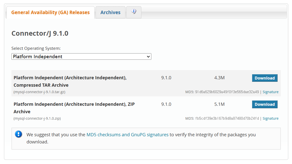 원하는 버전과 Platform Independent 선택 후 하단 Platform Independent (Architecture Independent), ZIP Archive 다운로드 하기