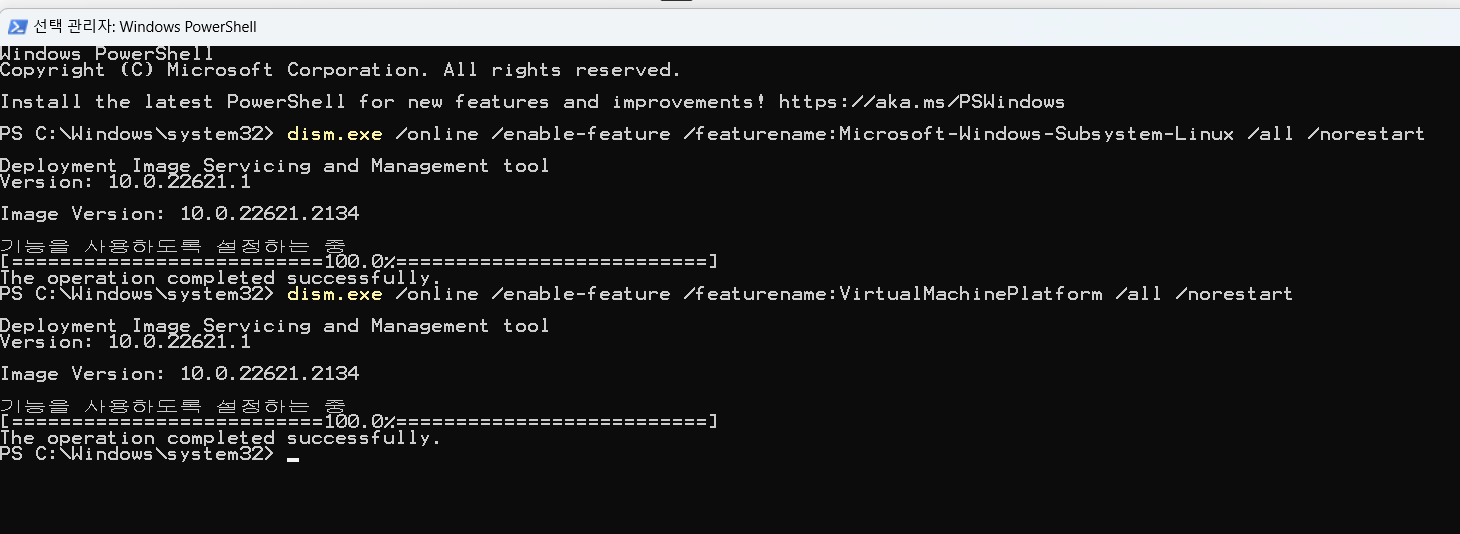 VirtualMachinePlatform 기능을 활성화시키는 명령어