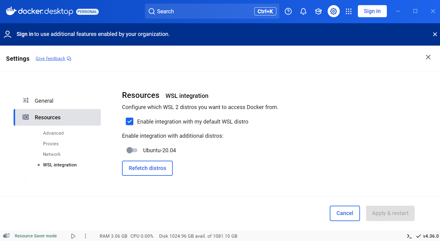 Enable Integration with my default WSL distro 체크 안 되어있다면 체크 후 Apply & Restart 클릭