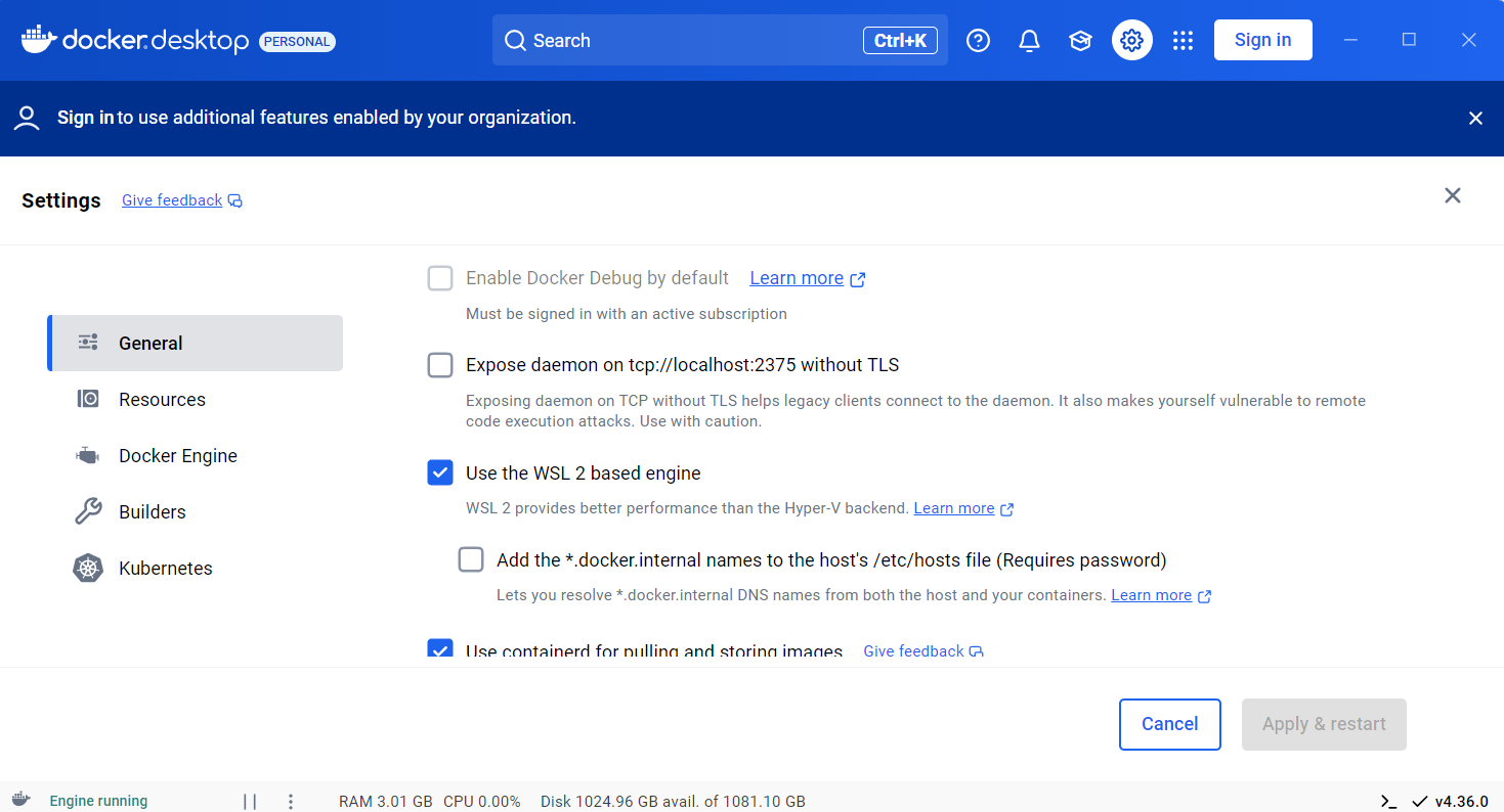 Use the WSL 2 based engine 체크 안 되어있다면 체크 후 Apply & Restart 클릭