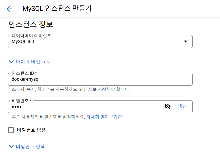 MySQL 버전과 인스턴스 ID, 루트계정 비밀번호를 입력해주고 인스턴스 생성