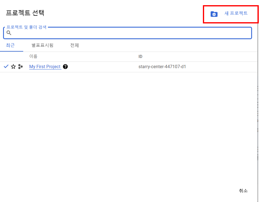 프로젝트 탭에서 새 프로젝트를 눌러 프로젝트를 생성한다.
