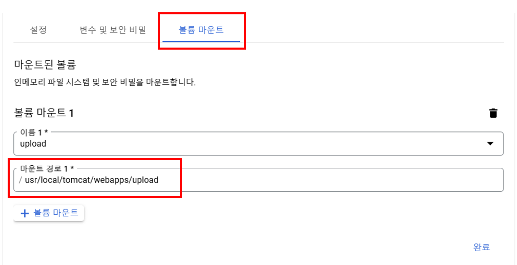 그리고 다시 컨테이너 탭으로 돌아와서 볼륨 마운트 탭으로 간다.