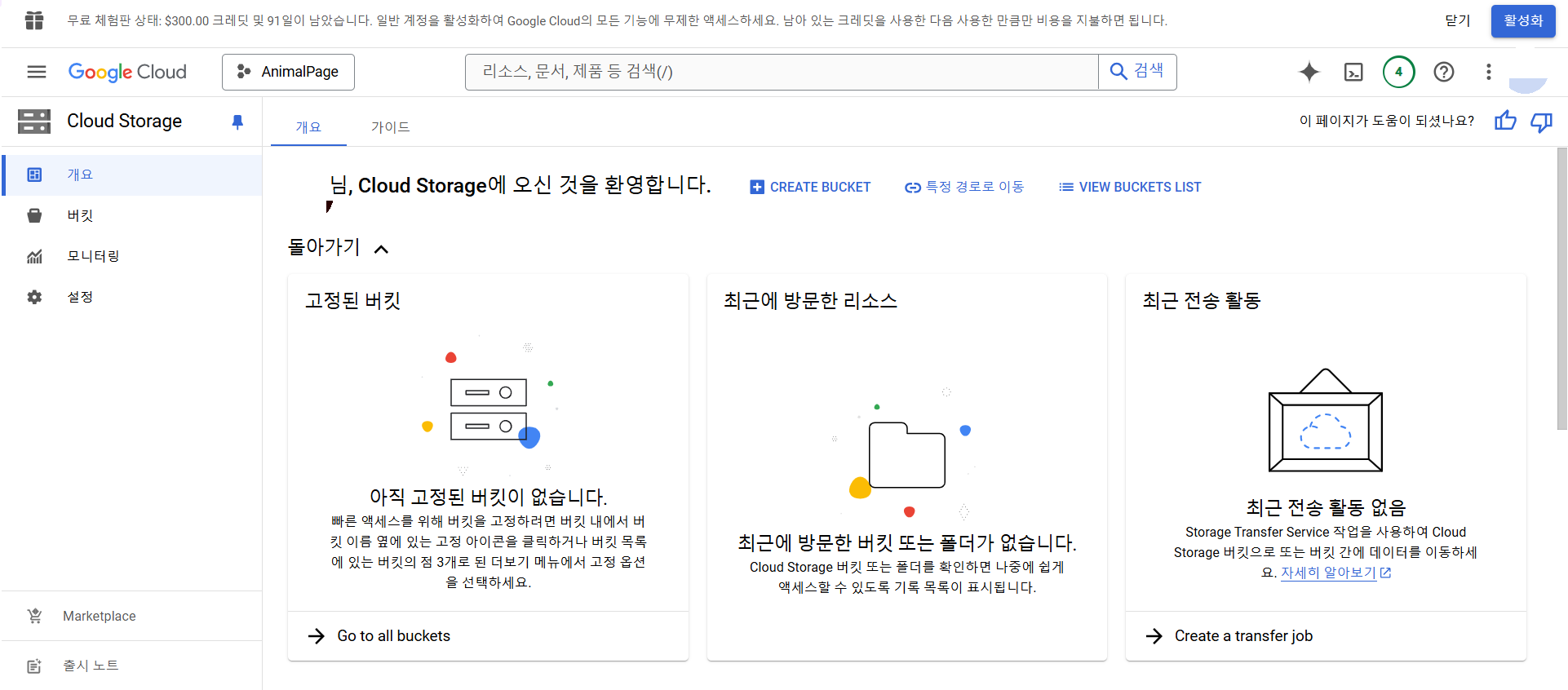 Cloud Storage 탭에서 버킷 선택 후 +만들기 버튼으로 새 버킷 생성