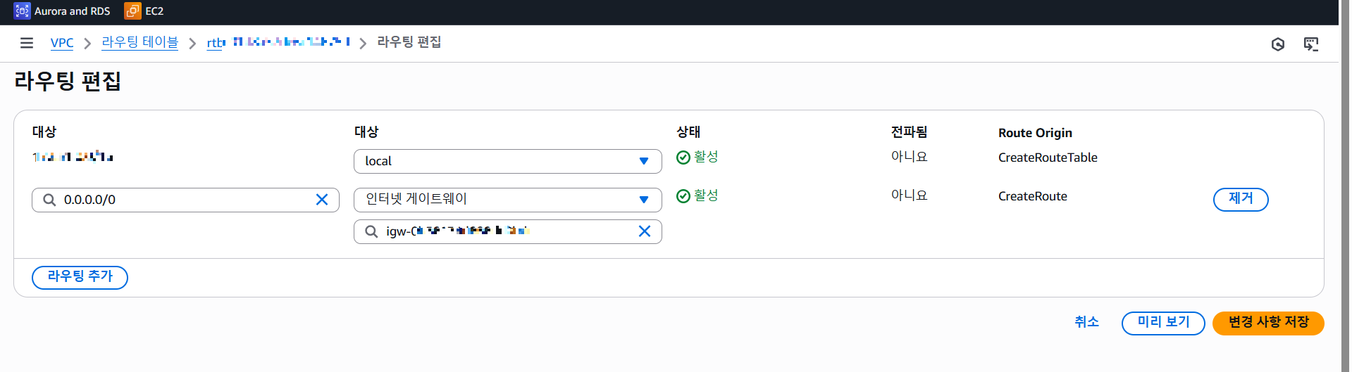 - 라우팅 생성으로 0.0.0.0/0의 인터넷 게이트웨이를 추가한다.
