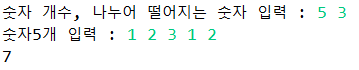 System.out.print("숫자 개수, 나누어 떨어지는 숫자 입력 : ");